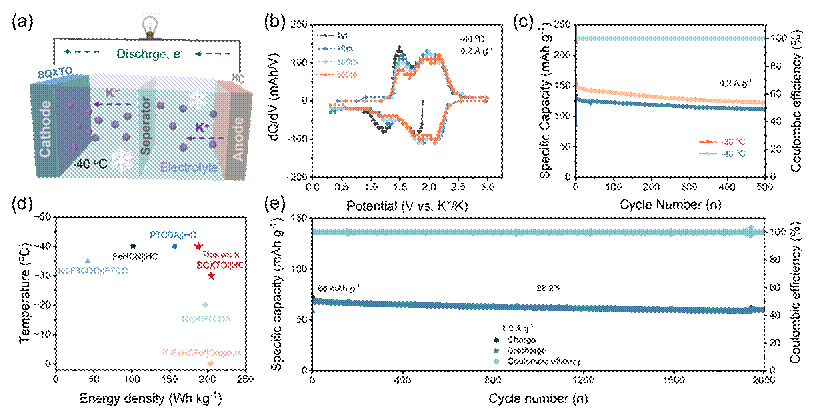 图4. HC||BQXTO全电池在-40°C低温下的电化学性能。(a) BQXTO||HC全电池的结构示意图;(b) dQ/dV曲线;(c) 0.2 A g-1电流密度下的循环性能;(d) 已报道钾离子全电池的能量密度与低温适应性对比图;(e) 1 A g-1电流密度下的长期循环稳定性测试。