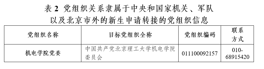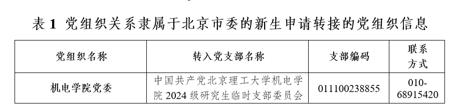 凡党员组织关系隶属于北京市委所辖基层党组织(含中央在京高校)的新生,由所在党组织通过“党员E先锋”系统申请转接,系统中目标党支部名称与支部编码根据录取学院及专业所对应的支部信息(如表1所示)填写,有效期默认为30天。新生可登录微信小程序“党员E先锋”(用户名:身份证号,初始密码:bj0701)查看转接进程。