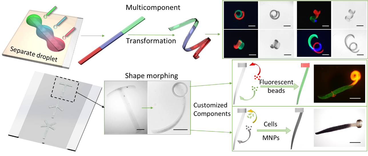 该团队在前期研究自形变褐藻酸微机器人的基础上(Nature Communications, vol. 12(1), 2021. https://doi.org/10.1038/s41467-020-20697-w),进一步探索了褐藻酸液体如何在非均一电场作用下固化为不同大小网格结构组成的凝胶体。发现这些网格结构不仅在受到离子浓度、pH值变化激励时能够膨胀、收缩使凝胶整体展现出特定的形变特征,还能像一张网包络嵌入各种径粒大小的成分。该发现激发了团队研发能够集成不同形变模式、功能成分的模块化微机器人的灵感。