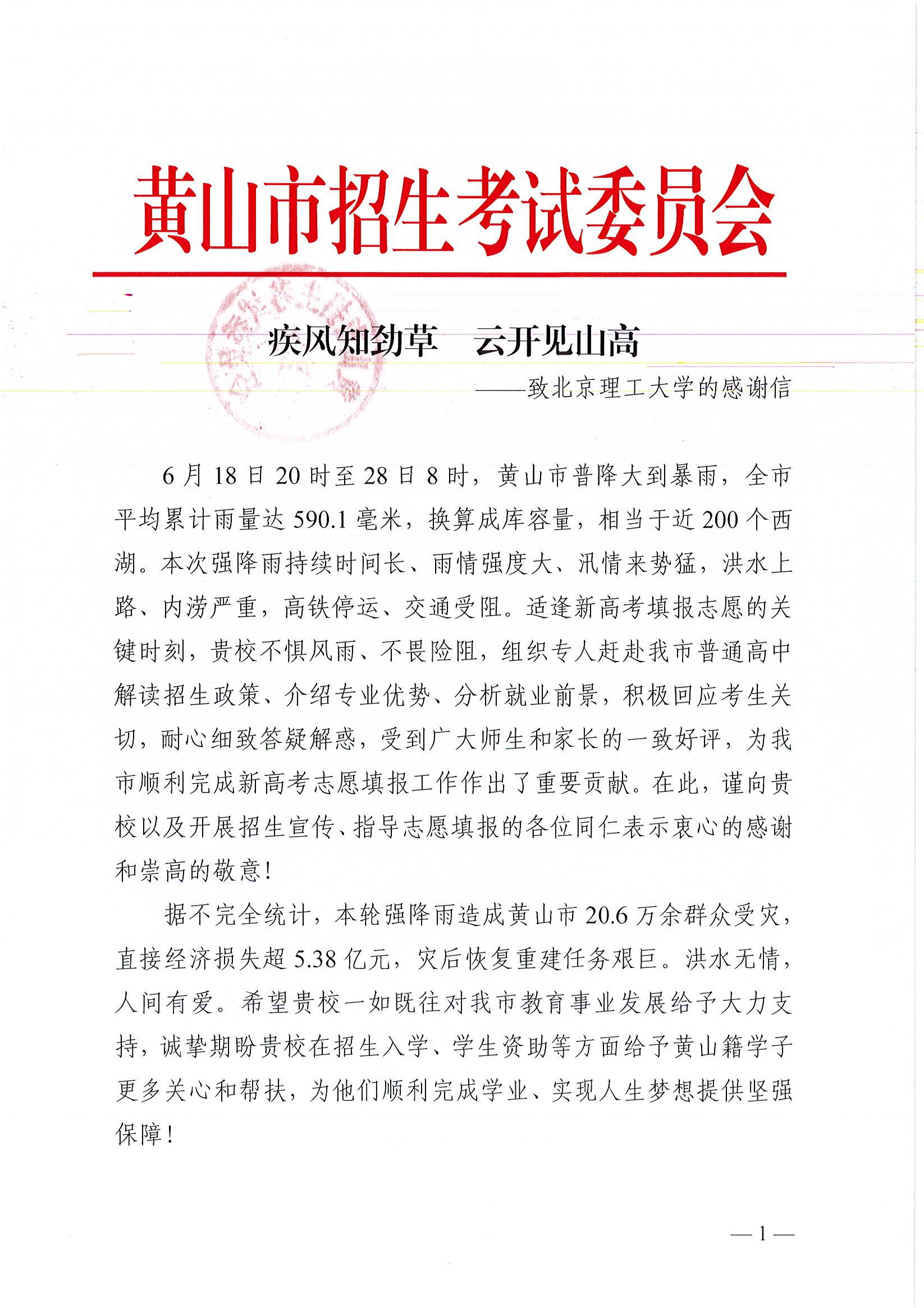 黄山市招生考试委员会向北理工安徽招生组发来感谢信