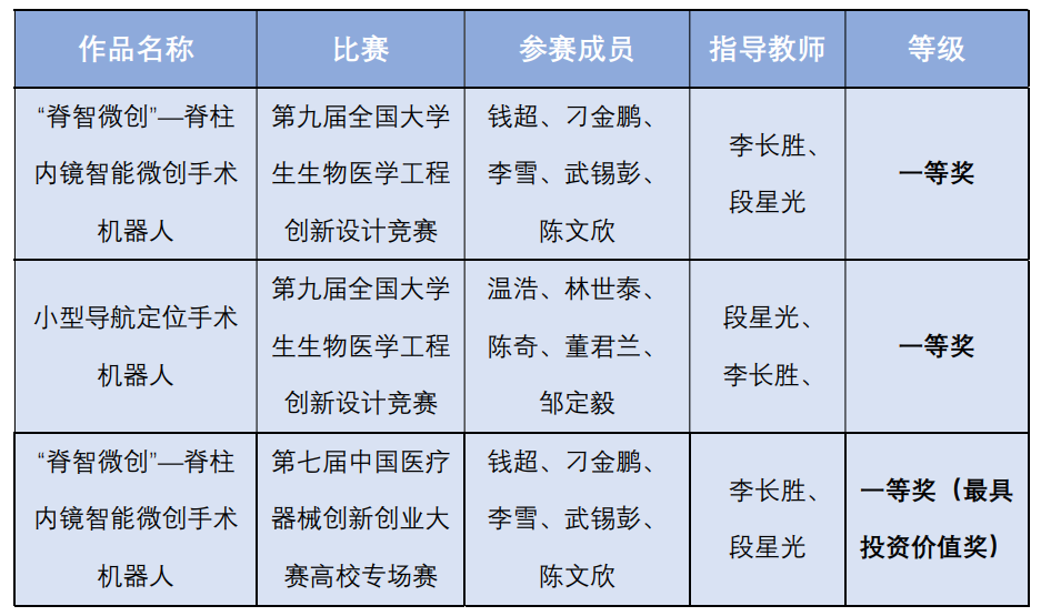 7月26日,由中国生物医学工程学会主办的第九届全国大学生生物医学工程创新设计竞赛在三亚市崖州湾科技城落下帷幕。澳门正规电子游戏平台医疗机器人实验室“‘脊智微创’-脊柱内镜智能微创手术机器人”和“小型导航定位手术机器人”团队从全国250所高校近万名选手、3000多个项目参赛队伍脱颖而出,荣获两项一等奖(获奖比例4%)。其中“脊智微创”—脊柱内镜智能微创手术机器人项目还获得大赛配套活动第七届中国医疗器械创新创业大赛高校专场赛一等奖和最具投资价值奖。