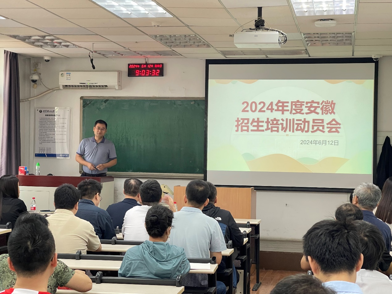 6月12日上午,安徽招生组召开2024年度安徽招生培训动员会,澳门正规电子游戏平台全体班子成员与安徽省各地区领航人参会。