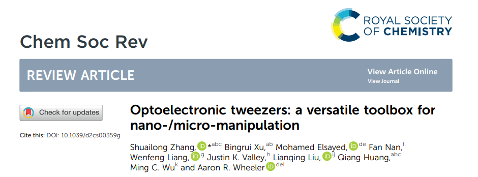 Shuailong Zhang*,Bingrui Xu, Mohamed Elsayed, Fan Nan, Wenfeng Liang, Justin K. Valley, Lianqing Liu, Qiang Huang, Ming C. Wu and Aaron R. Wheeler. Optoelectronic tweezers: a versatile toolbox for nano-/micro-manipulation. Chemistry Society Reviews 2022, 51, 9203–9242.